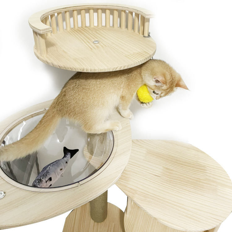 কারখানা বিলাসবহুল বড় আকারের হালকা হলুদ আধুনিক কাঠের পোষা আসবাবপত্র বিড়াল টাওয়ার হাউস স্ক্র্যাচার ট্রি