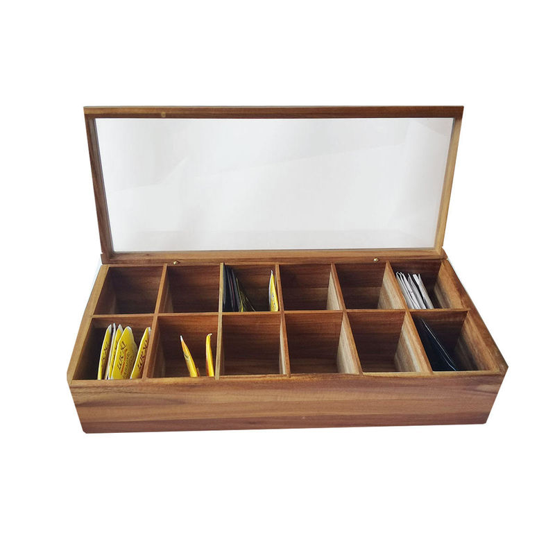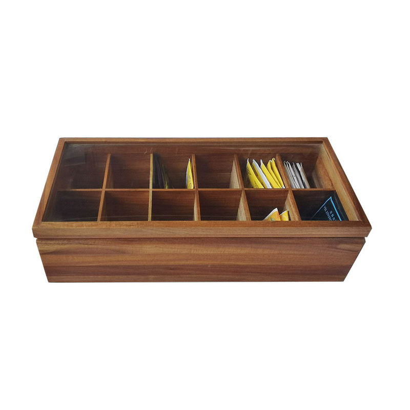 অ্যাডজাস্টেবল ফ্ল্যাট চেস্ট 12 টি কম্পার্টমেন্ট ফাইল করা সলিড কাঠের সংগঠক টি ব্যাগ বক্স স্টোরেজ অর্গানাইজার কাচের ঢাকনা সহ