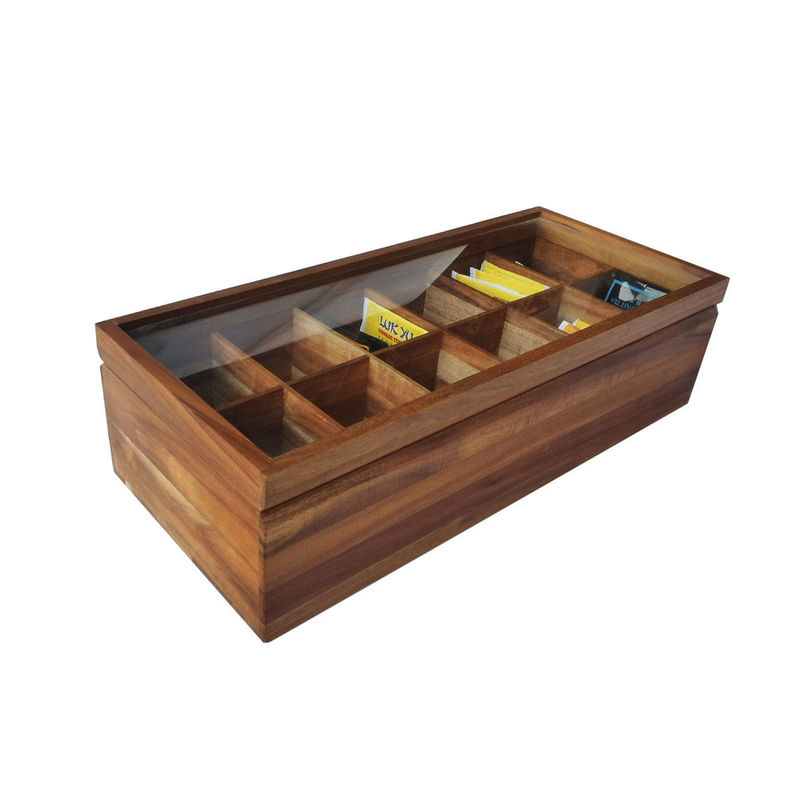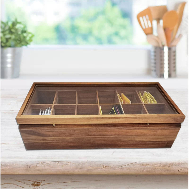 অ্যাডজাস্টেবল ফ্ল্যাট চেস্ট 12 বগি কাঠের চা ব্যাগ স্টোরেজ বক্স গ্লাস টপ 0