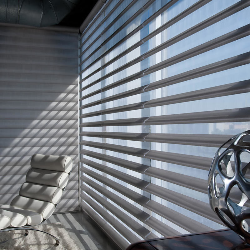 স্ট্রাইপড ব্লাইন্ডস ফ্যাব্রিক: শাংরি-লা স্টাইলের স্ট্রাইপড ইলেকট্রিক ব্লাইন্ডগুলি একটি উষ্ণ এবং সুরেলা আলংকারিক প্রভাব প্রদান করতে উচ্চ-মানের স্ট্রাইপযুক্ত প্যাটার্নযুক্ত কাপড়, সাধারণত নরম কাপড় বা টেক্সটাইল দিয়ে তৈরি।